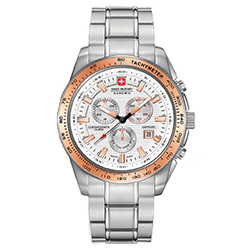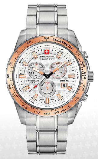 7. Swiss Military Hanowa Crusader Chrono 6-5225.04.001.09: корпус из нержавеющей стали 316L, безель с ионным покрытием розовой позолотой и тахиметрической шкалой, белый циферблат с часовыми индексами цвета розового золота, браслет из нержавеющей стали.