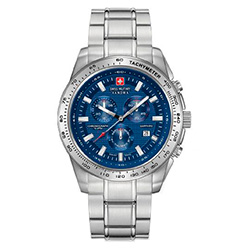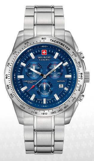 8. Swiss Military Hanowa Crusader Chrono 6-5225.04.003: корпус из нержавеющей стали 316L, серебристый безель с тахиметрической шкалой, синий циферблат с часовыми индексами серого цвета, браслет из нержавеющей стали.