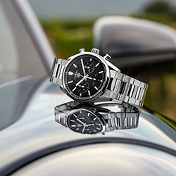 Версии с черным и синим циферблатом дополняет H-образный браслет из нержавеющей стали. Закругленные углы внутренних и наружных звеньев придают хронографу утонченный вид и обеспечивают особый комфорт при ношении. Двухцветная модель с серебристым циферблатом и стрелками с покрытием из розового золота, а также версия с темно-серым циферблатом представлены в комплекте с ремешком из кожи аллигатора благородного коричневого цвета. Сапфировое стекло на задней крышке корпуса с винтовым креплением позволяет наблюдать за работой уникального инновационного механизма с ротором цвета розового золота.
