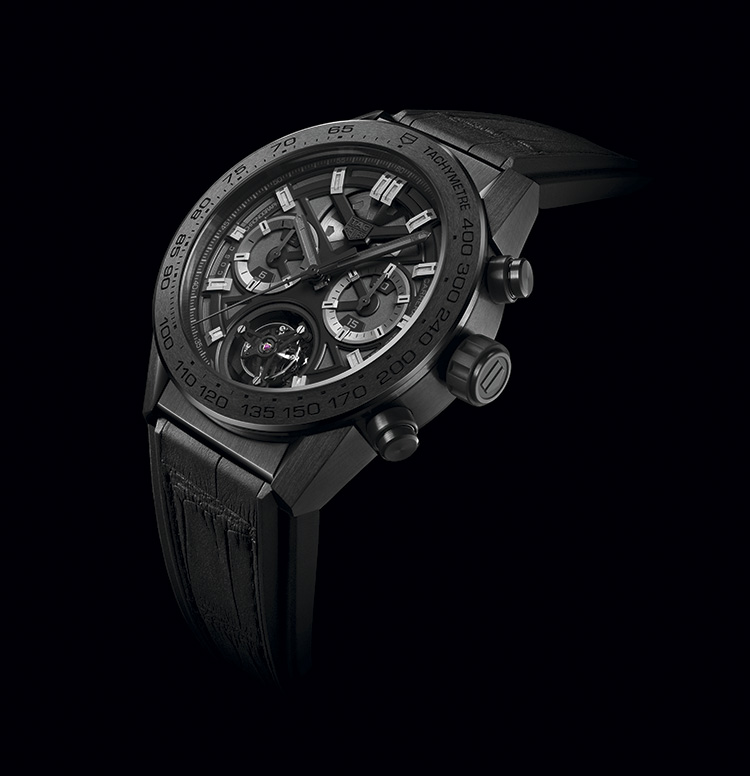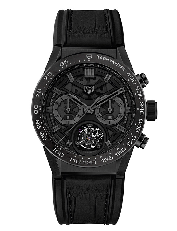 2. TAG Heuer Carrera Heuer-02T Tourbillon «Black Phantom» Limited edition CAR5A8Z. FC6377: модель «all black» ограниченной серии в количестве 250 индивидуально пронумерованных экземпляров: титановый корпус с чёрным покрытием из карбида титана всех его металлических элементов, чёрный керамический безель с серой тахиметрической шкалой; чёрный циферблат с условными часовыми индексами, стрелками и счётчиками хронографа из титана чёрного цвета, с серой надписью «COSC» между отметками «8 и 9 часов»; чёрный кожаный ремешок, титановая раскладывающаяся застёжка с чёрным покрытием из карбида титана, предохранительными кнопками и символом марки «TAG Heuer». | |