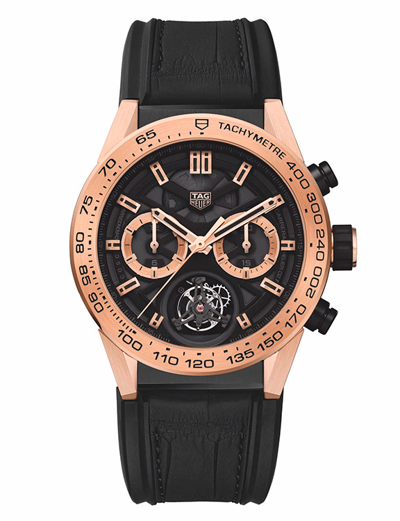 3. TAG Heuer Carrera Heuer-02Т Tourbillon Titanium and Rose Gold/ Ceramic Bezel CAR5A5Y. FC6377: титановый корпус с чёрным покрытием из карбида титана, кроме проушин для ремешка из 18 каратного розового золота, чёрный керамический безель с серой тахиметрической шкалой; чёрный циферблат с условными часовыми индексами, стрелками и счётчиками хронографа из титана с гальваническим покрытием из 18-каратного розового золота, с тёмно-серой надписью «COSC» между отметками «8 и 9 часов»; чёрный кожаный ремешок, титановая раскладывающаяся застёжка с чёрным покрытием из карбида титана, предохранительными кнопками и символом марки «TAG Heuer». | |