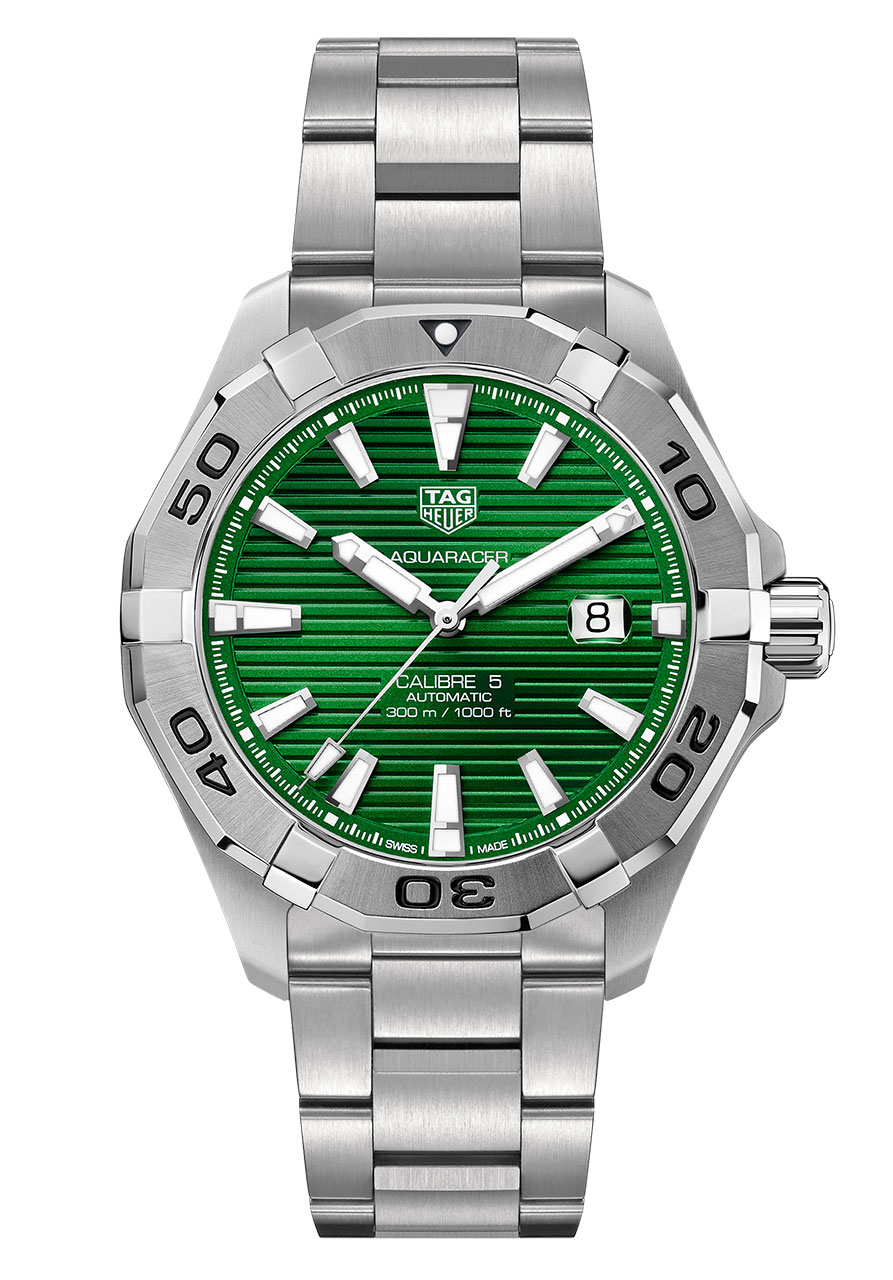 Модель Aquaracer с корпусом диаметром 43 мм имеет уникальный зеленый циферблат с эффектом sunray. Горизонтальные линии, украшающие циферблат, напоминают деревянный причал, вдоль которого мерно качаются парусники. На циферблате есть указатель даты, а индексы, безель и треугольный указатель на отметке «12 часов» покрыты черным лаком. Модель женской коллекции с корпусом диаметром 32 мм обладает таким же ярким циферблатом, а ее индексы украшены бриллиантами. На циферблате также есть указатель даты и треугольный указатель на отметке «12 часов» для оптимальной считываемости времени. Корпус и ремешок новых Aquaracer выполнен из нержавеющей стали. Мужская модель с корпусом 43 мм оснащена автоматическим механизмом Calibre 5, а женская модель обладает кварцевым механизмом.