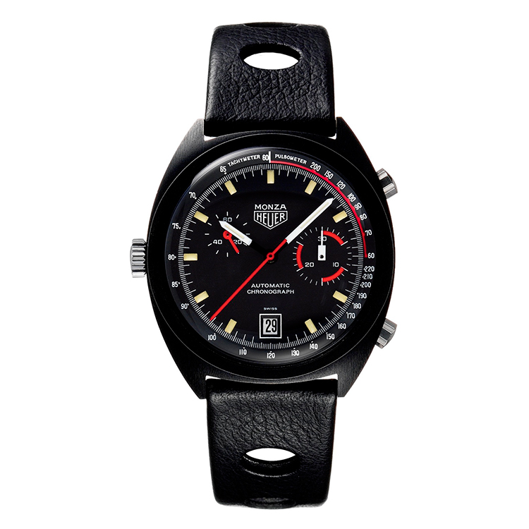 В-третьих, комплектация чёрным перфорированным ремешком из натуральной кожи. Смена поколений отражена в увеличении диаметра корпуса с 39 мм до 42 мм, замене стали на титан, а также чёрного PVD-покрытия – на покрытие из карбида титана. Кроме того, современная версия часов «Tag Heuer Monza» оснащена не только тахиметрической шкалой для измерения скорости, но и пульсометром для измерения сердечного ритма.