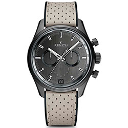 1. Zenith El Primero Range Rover Special Edition 24.2040.400/27.R797 Корпус из алюминиевого сплава с чёрным матовым покрытием из оксидной керамики. Матовый тёмно-серый циферблат с вертикальным сатинированием, центральными стрелками часов и минут и накладными условными часовыми индексами со скошенными гранями, родиевым напылением и люминесцентным покрытием белого цвета. Центральный 60-секундный, 30-минутный и 12-часовой счётчики хронографа; малая секундная стрелка и окошко даты. Чёрный каучуковый ремешок с декоративным покрытием из перфорированной телячьей кожи цвета слоновой кости и с тройной раскладывающейся титановой застёжкой с чёрным DLC-покрытием. |