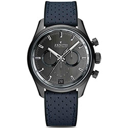 2. Zenith El Primero Range Rover Special Edition 24.2040.400/27.R796 Корпус из алюминиевого сплава с чёрным матовым покрытием из оксидной керамики. Матовый тёмно-серый циферблат с вертикальным сатинированием, центральными стрелками часов и минут и накладными условными часовыми индексами со скошенными гранями, родиевым напылением и люминесцентным покрытием белого цвета. Центральный 60-секундный, 30-минутный и 12-часовой счётчики хронографа; малая секундная стрелка и окошко даты. Чёрный каучуковый ремешок с декоративным покрытием из перфорированной телячьей кожи синего цвета и с тройной раскладывающейся титановой застёжкой с чёрным DLC-покрытием. |