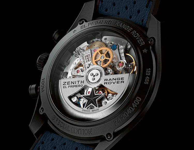 Металлическая часть задней крышки, с покрытием аналогичным покрытию корпуса, имеет гравированные идентифицирующие надписи: «El Primero Range Rover – Special Edition». Конструкция корпуса обладает водонепроницаемостью на глубине до 100 м при давлении до 10 атм.